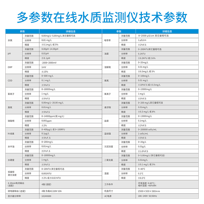 产品名称:立柜多参数在线水质检测仪 型号:LH-G8700(8参数任选:PH、余氯、浊度、电导率、溶解氧、温度、悬浮物、污泥浓度、ORP、COD、氨氮、水中油、蓝绿藻、叶绿素、硝酸根、盐度、臭氧、二氧化氯、氟化物、氯离子、水硬度) 产品介绍: LH-G8700多参数在线水质检测仪(落地柜式)是集成多元化一体的智慧监测设备,本产品采用全数字化电极作为检测元件,配备自主设计的流通池,产品检测灵敏度高,性能稳定可靠。本产品配备计算机数据软件,具有在线检测、曲线分析、存储以及电脑远程监控,手机 APP 实时查询等功能。 本产品可同时测量多种参数,十寸高清显示屏,不仅可以查看实时监测参数,还能查看运行曲线、 历史数据等。也可接入报警系统,作为泳池饮用水、养殖等监测设备。 本产品根据不同客户需求,可选择匹配电极检测多种参数,例如检测PH、余氯、电导率、浊度等参数,广泛应用于自来水、饮用水、泳池水、农业、养殖、工业废水、环保等多种不同需求的领域。 产品特点: 1、7寸高清LCD工业触摸屏同时显示8个参数:PH、余氯、浊度、电导率、溶解氧、温度、悬浮物、污泥浓度、ORP、COD、氨氮、水中油、蓝绿藻、叶绿素、硝酸根、盐度、臭氧、二氧化氯、氟化物、氯离子、水硬度。 2、画面清新直观,一目了然。 3、触屏按键,一键切换参数、曲线图、查询历史数据,操作方便简单。 4、无线SIM卡连接,远程电脑监控,手机APP实时查询。 5、全数字化电极,各电极自带温补,性能稳定可靠。 6、余氯电极采用恒压法,无需电解液,配套专用的流通槽,灵敏度高、响应快、7、使用寿命长。 8、数字pH电极,抗干扰性能好。 9、浊度电极流通槽具有自动排水功能,根据程序设定的时间间隔,定时排空流通槽内部积水,防止污渍沉淀。 10、电导率数字电极,轻松标定,抗干扰力强,响应速度快。 11、水路设置有流量计、过滤器,适用于复杂水路的安装环境。 12、具有缺水报警记录功能,便于用户分析数据。 13、参数设置按屏幕提示进行,操作人机互动,简单方便。 14、恢复出厂设置功能,避免误操作后重新设定数据。 15、IP65防护等级,防水、防潮、防尘保证仪器使用寿命。 16、本仪器严格按照ISO9001 2015 质量管理体系要求生产,并在出厂前经过严格检测和校正,满足说明书各项指标要求。 技术参数: 参数 详细信息 PH 测量范围 00.00pH~14.00pH 分辨率 0.01pH 精度 ±0.02pH 电导率 测量范围 0~2000μS/cm 分辨率 1μS/cm 精度 ±2%F.S 溶解氧(极普法) 测量范围 0~20mg/L,0-200% 分辨率 0.01mg/L 精度 ±5% 溶解氧(荧光法) 测量范围 0~20mg/L或0-200%饱和度 分辨率 0.01mg/L 精度 ±0.3mg/L或±5% ORP 测量范围 -2000~2000mV 分辨率 1mV 精度 ±15% COD 测量范围 0~600mg/L equiv.KHP 分辨率 0.1mg/L 精度 ±5%F.S 余氯 测量范围 00.00mg/L~3.00mg/L 分辨率 0.01mg/L 精度 0.01-0.20mg/L时±0.02mg/L 0.20-3.00mg/L时±0.1mg/L或5%取较大者 氨氮 测量范围 0~100mg/L 分辨率 0.01mg/L 精度 ±10%测量值或±0.5mg/L取较大者 臭氧 测量范围 00.00mg/L~20.00mg/L 分辨率 0.01mg/L 精度 ±5%F.S 二氧化氯 测量范围 00.00mg/L~20.00mg/L 分辨率 0.01mg/L 精度 ±5%F.S 污泥浓度 测量范围 0~20g/L 分辨率 0.01g/L 精度 ±1%F.S 硝酸根 测量范围 0~14000ppm(或mg/L) 分辨率 0.1ppm 精度 ±2%F.S 盐度 测量范围 0~13000mg/L 分辨率 0.01g/L 精度 ±2%F.S 氯离子 测量范围 0~10000mg/L 分辨率 1mg/L 精度 ±5%F.S 氟离子 测量范围 0~10000mg/L 分辨率 1mg/L 精度 ±5%F.S 叶绿素 测量范围 0~400µg/L或0-100RFU 分辨率 0.1µg/L或0.1%RFU 精度 ±5%F.S 水中油 测量范围 0-50ppm或0-0.40FLU 分辨率 0.01ppm 精度 ±3%F.S 蓝绿藻 测量范围 0-200,000 cells/mL 分辨率 1cells/mL 精度 ±5%F.S 水硬度 测量范围 0~10000mg/L 分辨率 1mg/L 精度 ±5%F.S 温度 测量范围 0~60℃ 分辨率 0.1℃ 精度 ±0.3℃ 浊度 测量范围 0-20NTU 0-200NTU 0-1000NTU 0-3000NTU 分辨率 0.01NTU 0.01NTU 1NTU 1NTU 精度 ≤5NTU时≤±0.3NTU >5NTU时≤±6% ≤10NTU时≤±0.5NTU >10NTU时≤±8% 悬浮物 测量范围 0-200mg/L 0-1000mg/L 0-3000mg/L 分辨率 0.01mg/L 0.1mg/L 精度 ≤±0.3mg/L或≤±6% ≤±0.5mg/L或≤±8% 工作条件 环境温度0-60℃,相对湿度<90%RH 尺寸 1500*600*380mm AC电源 186-240V 50/60Hz 输出 4路:4-20mA电流输出(选配) 继电器输出 4路负载AC220V 10A