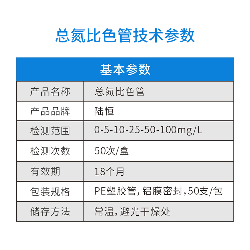 产品名称:总氮比色管 一、定义: 快速检测系列为半定量检测产品,检测结果为区间值,所以不存在精确度、准确度等概念,灵敏度为最低检测限。 广泛应用于城市供水、食品饮料、环境、医疗、化学、制药、热电、造纸、养殖、生物工程、发酵工艺、纺织印染、石油化工、水处理等领域的水质现场快速检测。 二、基本特点: 1、能够在相对短的时间内对指标进行检测并读取数据。 2、操作简单,无需其他配件。 3、携带方便,适合现场检测。 三、产品参数: 品 牌:陆恒生物 检测范围:0-5-10-25-50-100mg/l 检测次数:50次/盒 有 效 期:18个月 包装规格:PE塑胶管,铝膜密封,50支/包 储存方法:常温、避光干燥处 四、使用说明: 1、取0.3ml被测溶液。加入1.5mlK-1试剂,加入K-2试剂。 2、盖上盖子摇晃30秒,取下盖子后放置15分钟。 3、拔出管尖端的线。赶出管中的空气。 4、插入容器底部,尽可能的将容器中的被测溶液吸入管内。 5、8分钟后与标准比色卡比色。