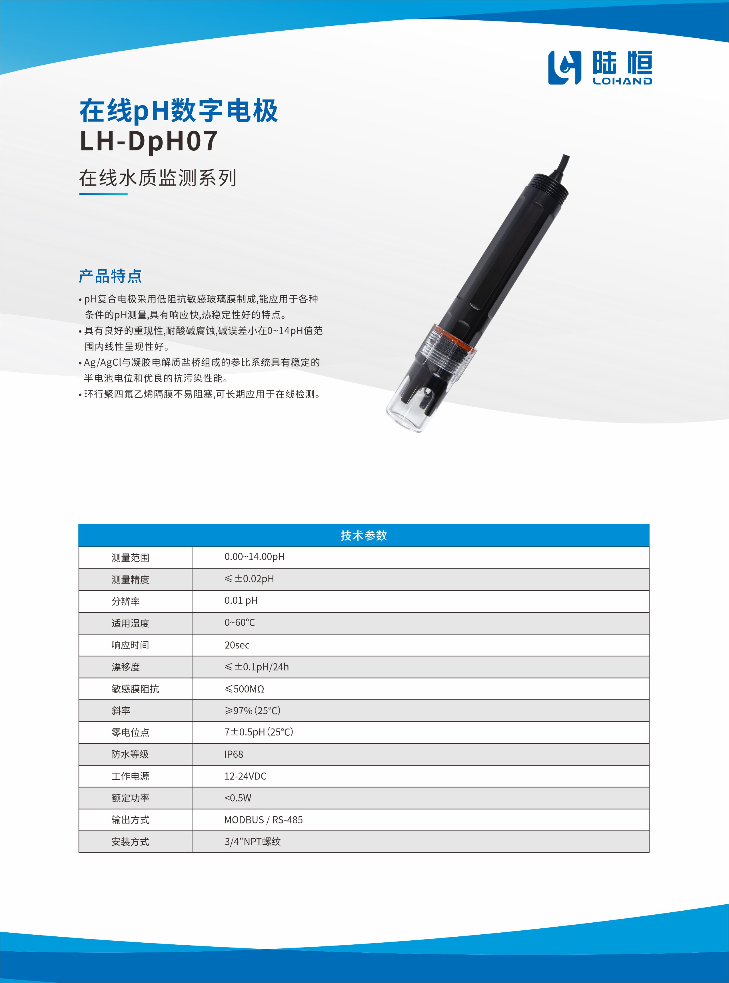 产品名称:数字PH传感器 型号:LH-DpH07 产品简介: 该款产品是将电子线路及微处理器集成于传感器内部的数字式传感器,简称数字电极,具有以下特点。 主要特点: 1、RS-485传输接口,MODBUS-RTU通讯协议,双向通讯。 2、电源及输出隔离设计,确保电气安全性。 3、内建保护电路,增强抗干扰能力,以适应复杂的环境。 4、通信协议简单易用,能够输出更多电极诊断信息,更为智能化。 5、低功耗的设计以应对更多的使用场合,内部存储器在断电情况下能够保存校准及设置信息。 6、PPS壳体,耐腐蚀能力强,3/4前后螺纹,方便安装。 7、pH复合电极采⽤低阻抗敏感玻璃膜制成,能应用于各种 条件的pH测量,具有响应快,热稳定性好。 8、具有良好的重现性,耐酸碱腐蚀,误差小,在0~14pH值范围内线性呈现性好。 9、Ag/AgCl与凝胶电解质盐桥组成的参比系统具有稳定的半电池电位和优良的抗污染性能。 10、环行聚四氟乙烯隔膜不易阻塞,可长期应用于在线检测。 技术参数: 测量范围 0~14pH 测量精度 ≤±0.02pH 适用温度 0~60℃ 响应时间 20sec 漂移度 ≤±0.1pH/24h 敏感膜阻抗 ≤500MΩ 斜率 ≥97%(25℃) 零电位点 7±0.5pH(25℃) 防水等级 IP68 供电电源 12-24VDC 功耗 <0.5w 安装螺纹 3/4″NPT螺纹 尺寸 27*167.5mm 线长 标配5米,可订制 电极材料 PC 输出方式 MODBUS/RS485
