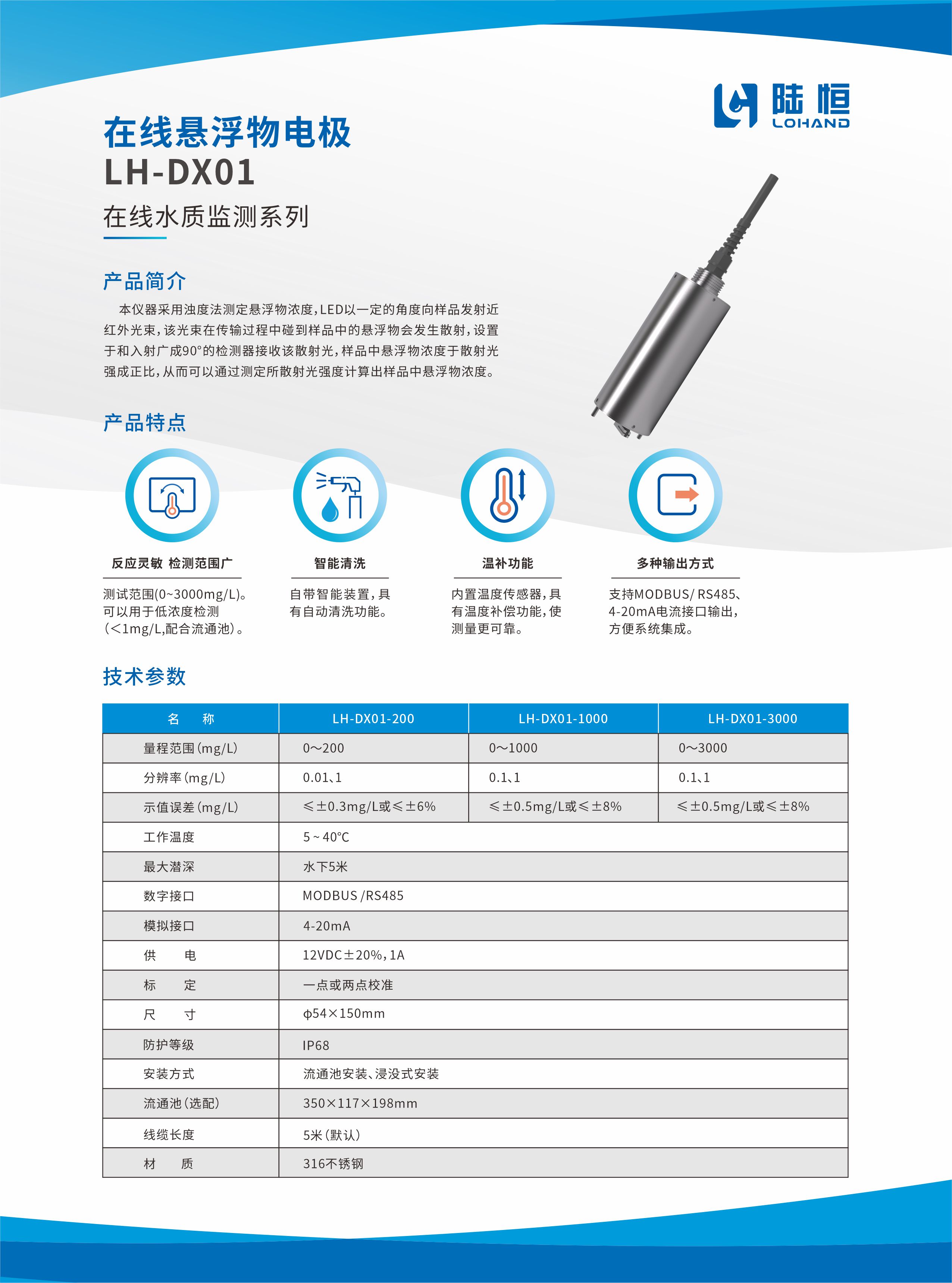 产品名称:数字悬浮物传感器 型号:LH-DX01 产品简介: 本仪器采用90°散射光法,近红外光源,消除色度于扰,符合IS07027标准。LED以一定的角度向样品发射近红外光束,该光束在传输过程中碰到样品中的悬浮物会发射散射,设置于和入射光成90°的检测器接收该散射光,样品中悬浮物浓度与散射光强成正比,从而可以通过测定所散射光强度计算出样品中悬浮物浓度以及浊度。 适用于饮用水处理厂、自来水、游泳池水、河道水和企业排放污水等对水溶液中的浊度、悬浮物浓度进行连续监测。 主要特点: 1、RS-485、4-20ma传输接口,MODBUS-RTU通讯协议,双向通讯。 2、电源及输出隔离设计,确保电气安全性。 3、内建保护电路,增强抗干扰能力,以适应复杂的环境。 4、通信协议简单易用,能够输出更多电极诊断信息,更为智能化。 5、低功耗的设计以应对更多的使用场合,内部存储器在断电情况下能够保存校准及设置信息。 6、316L壳体,耐腐蚀能力强,3/4后螺纹,方便安装。 7、IP68、可长期在水下工作。 8、测试范围广(0~3000mg/l)。 9、可以用于低浊度检测(<1mg/l,配合流通池)。 10、自带雨刮器,具有自动清洗功能。 11、内置温度传感器,具有水温自动补偿功能。 技术参数: 名称 LH-DX01 量程范围(mg/L) 0~200 0~1000 0~3000 分辨率(mg/L) 0.01、1 0.1、1 0.1、1 示值误差(mg/L) ≤±0.3mg/L或≤±6% ≤±0.5mg/L或≤±8% ≤±0.5mg/L或≤±8% 工作温度 5~40℃ 最大潜深 水下5米 数字接口 MODBUS/RS485 模拟接口 4-20mA 供电 12VDC±20%,1A 功耗 平常功率:<0.5W 启动清洁刷:<3W 标定 一点或两点校准 防护等级 IP68 安装方式 流通池安装、浸没式安装,3/4″NPT螺纹 材质 316不锈钢 尺寸 Φ54*150mm 流通池(选配) 210*110*220mm 线缆长度 5米(默认)