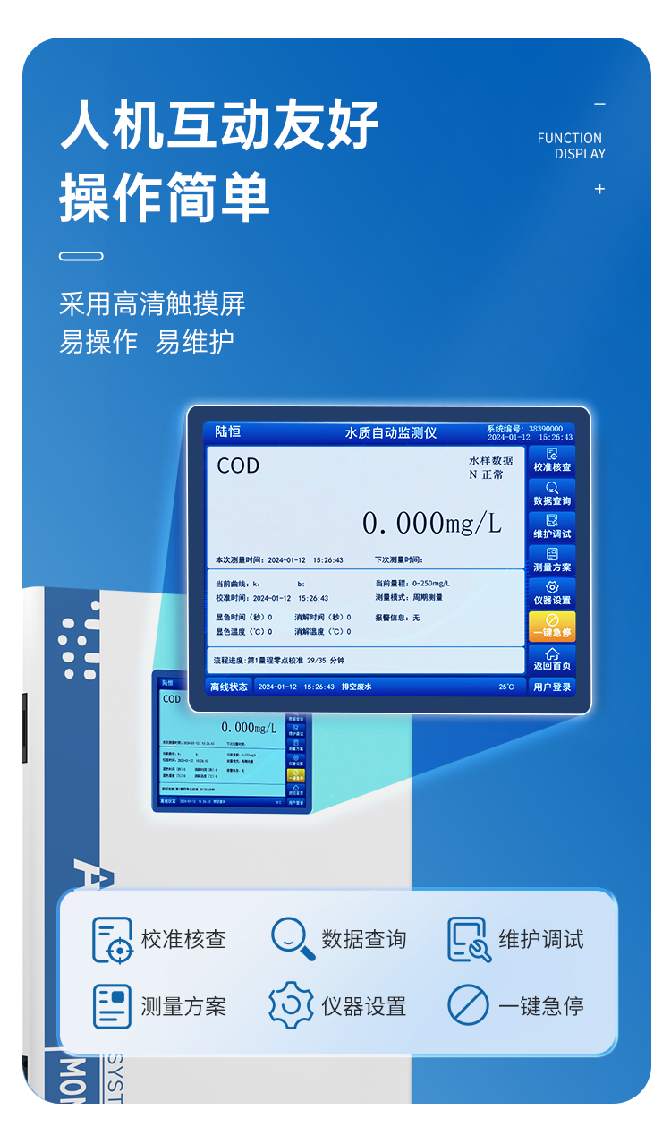 8.国内首台依据“污染源水质在线监测数据有效性审核体系”要求而开发的操作软件,集成了【仪器标定】、【质控样批次检测】、【零点漂移测量】、【量程漂移测量】等诸多高端功能,大大节约了企业运维人员与环保责任部门检查人员的工作量。